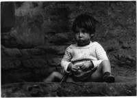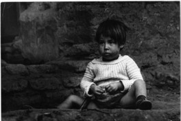 Retrato de un niño pequeño sentado en el suelo, delante de un muro de adobe. Viste un suéter de lana claro, y sostiene un objeto en sus manos. Su rostro muestra rastros de suciedad. La escena transmite sencillez y refleja un entorno rural.