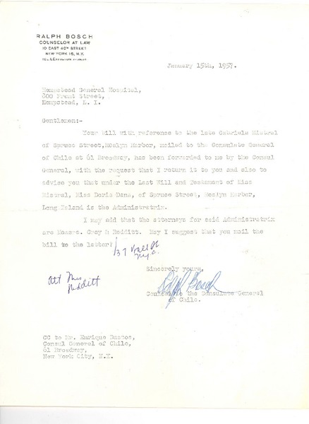 [Carta] 1957 jan. 15, New York [a] Hempstead General Hospital, New York [manuscrito] Ralph Bosch.
