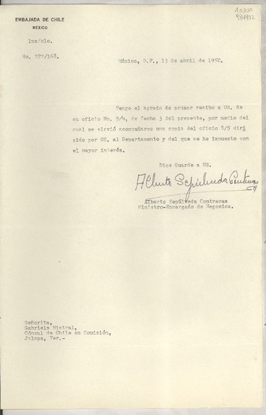 [Oficio] N° 272168, 1950 abr. 13, México, D.F., México [a la] Señorita, Gabriela Mistral, Cónsul de Chile en Comisión, Jalapa, Ver., [México] [manuscrito] / Alberto Sepúlveda Contreras, Ministro-Encargado de Negocios.