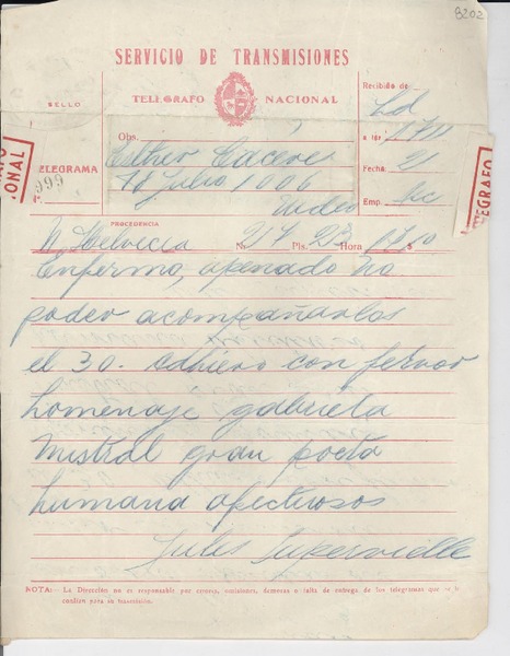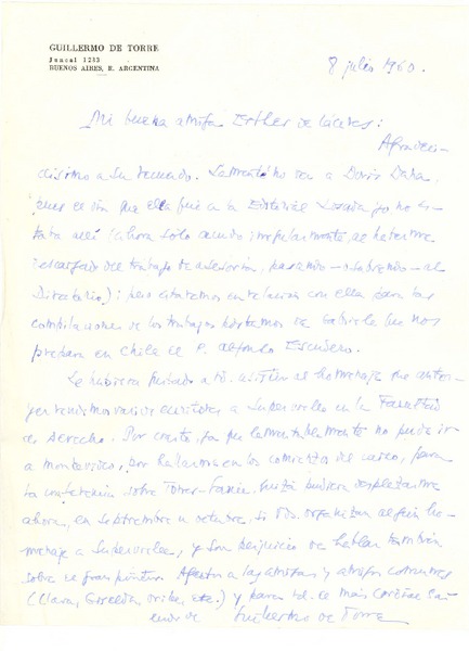 [Carta] 1960 jul. 8, Buenos Aires, Argentina [a] Esther de Cáceres, [Montevideo] [manuscrito] Guillermo de Torre.