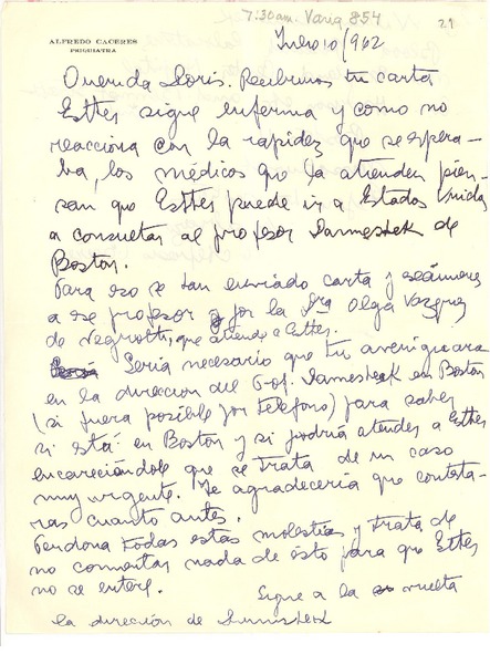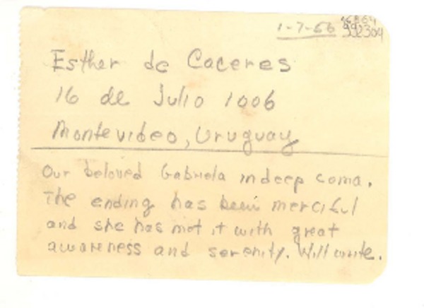 [Carta] 1957 Jan. 7, [Estados Unidos] [a] Esther de Cáceres, Montevideo, Uruguay [manuscrito] Doris Dana.