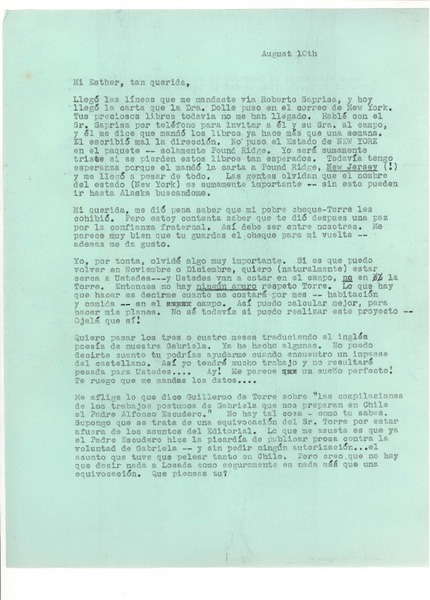 [Carta] [1960] ago. 10, [New York] [a] Esther de Cáceres, [Montevideo] [manuscrito] Doris Dana.