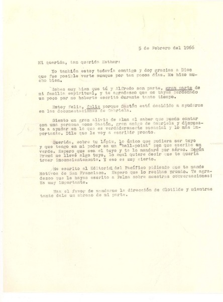 [Carta] 1966 feb. 5, [New York] [a] Esther de Cáceres, [Montevideo] [manuscrito] Doris Dana.