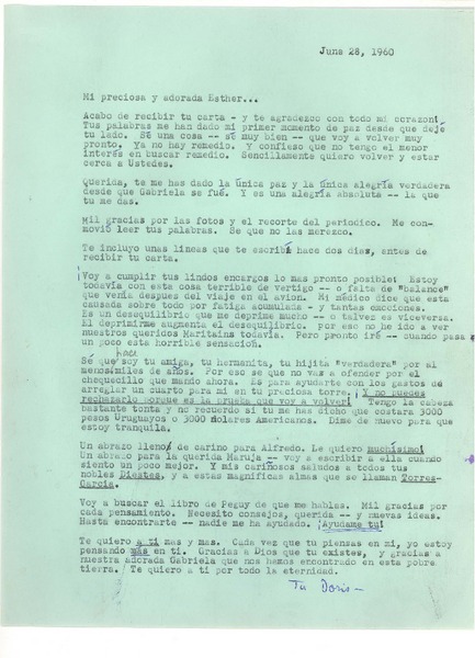 [Carta] 1960 jun. 28, [New York] [a] Esther de Cáceres, [Montevideo] [manuscrito] Doris Dana.
