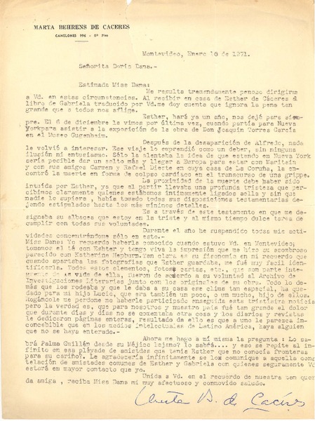[Carta] 1971 ene. 10, Montevideo, Uruguay [a] Doris Dana, [New York] [manuscrito] Marta Behrens de Cáceres.