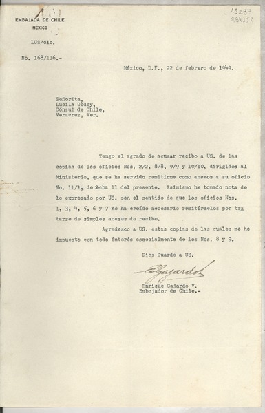 [Oficio] N° 168116, 1949 feb. 22, México, D.F., México [a la] Señorita Lucila Godoy, Cónsul de Chile, Veracruz, Ver., [México] [manuscrito] / Enrique Gajardo V. Embajador de Chile.