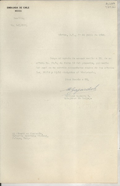[Oficio] N° 451277, 1949 jun. 22, México, D.F., México [al] Cónsul en Comisión, Señorita Gabriela Mistral, Jalapa, Ver., [México] [manuscrito] / Enrique Gajardo V. Embajador de Chile.