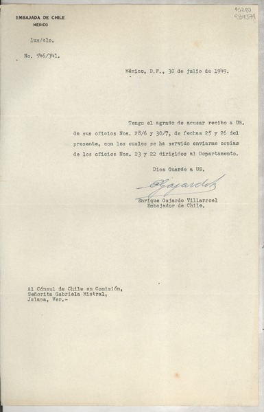 [Oficio] N° 546341, 1949 jul. 30, México, D.F., México [al] Cónsul de Chile en Comisión, Señorita Gabriela Mistral, Jalapa, Ver., [México] [manuscrito] / Enrique Gajardo Villarroel Embajador de Chile.
