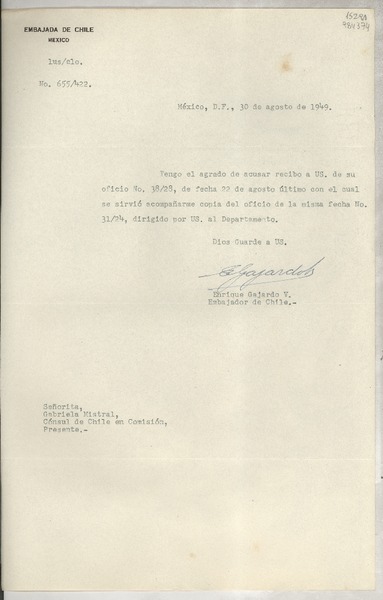 [Oficio] N° 655422, 1949 ago. 30, México, D.F., México [a la] Señorita, Gabriela Mistral, Cónsul de Chile en Comisión, [México?] [manuscrito] / Enrique Gajardo V. Embajador de Chile.
