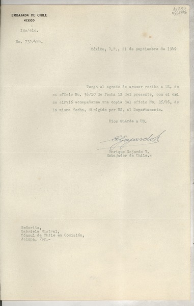 [Oficio] N° 732484, 1949 sept. 21, México, D.F., México [a la] Señorita, Gabriela Mistral, Cónsul de Chile en Comisión, Jalapa, Ver., [México] [manuscrito] / Enrique Gajardo V. Embajador de Chile.