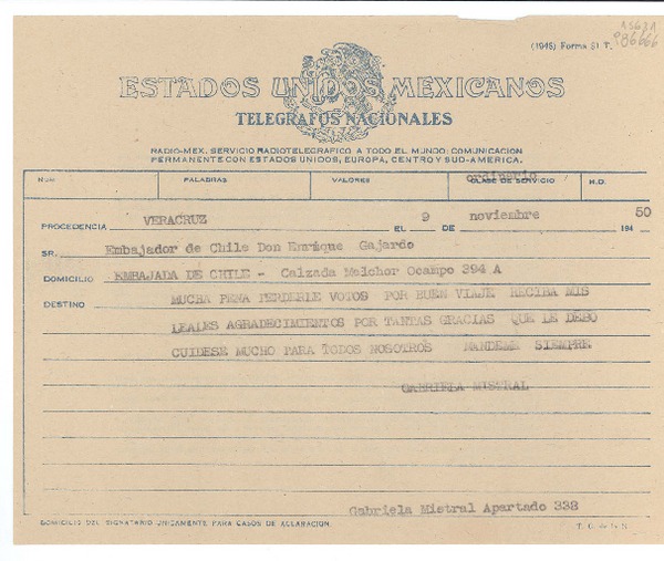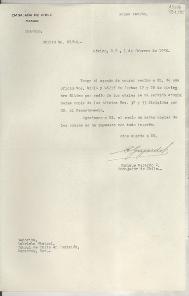Oficio N° 6740, 1950 feb. 1, México, D.F., México [a la] Señorita, Gabriela Mistral, Cónsul de Chile en Comisión, Veracruz, Ver., [México] [manuscrito] / Enrique Gajardo V. Embajador de Chile.