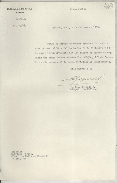[Oficio] N° 8148, 1950 feb. 2, México, D.F., México [a la] Señorita, Gabriela Mistral, Cónsul de Chile en Comisión, Jalapa, Ver., [México] [manuscrito] / Enrique Gajardo V. Embajador de Chile.