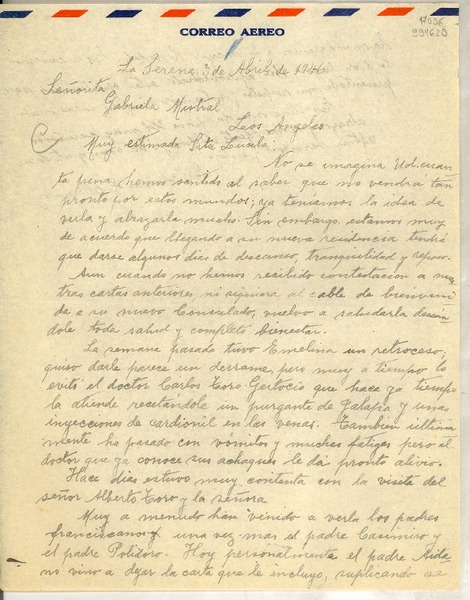 [Carta] 1946 abr. 6, La Serena [a] Lucila Godoy A., Los Angeles [manuscrito] Cristobalina T. de Ramírez