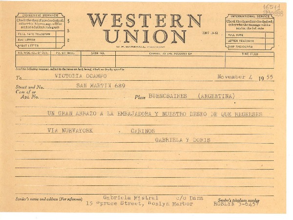 [Telegrama] 1954 abr. 8, Roslyn Harbor, new York [a] Victoria Ocampo, Buenos Aires [manuscrito] Gabriela y Doris