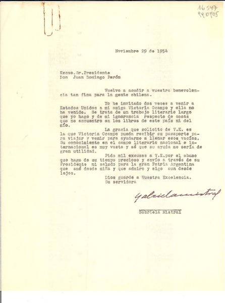 [Carta] 1954 nov. 29 [al] Excmo. Sr. Presidente, Don Juan Domingo Perón [manuscrito] Gabriela Mistral.