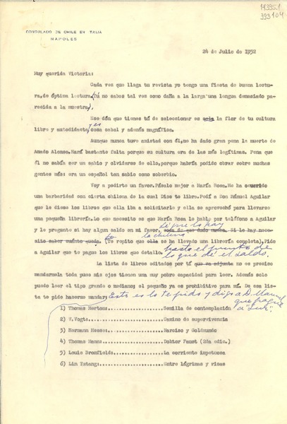 [Carta] 1952 jul. 24, [Nápoles, Italia] [a] Muy querida Victoria [manuscrito] Gabriela Mistral.