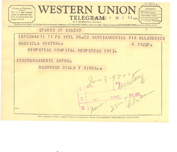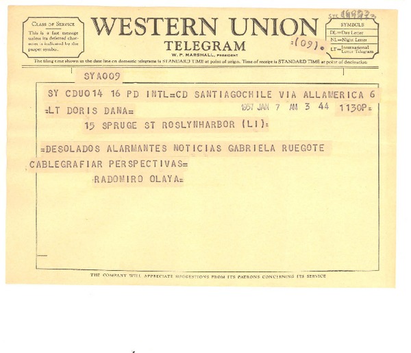 [Telegrama] 1957 jan. 7, Santiago, Chile [a] Doris Dana, New York, [Estados Unidos] [manuscrito] Radomiro y Olaya.