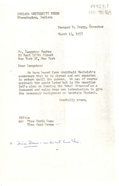 [Carta] 1957 mar. 13, Bloomington, Indiana, [Estados Unidos] [a] Langston Hughes, con copia a Doris Dana y Joan Daves, New York, [Estados Unidos] [manuscrito] Bernard B. Perry.