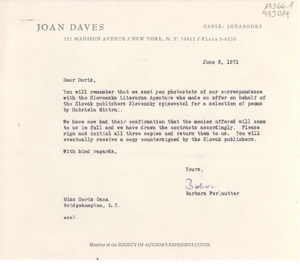 [Carta] 1971 June 8, 515 Madison Avenue, New York, N. Y. 10022, [EE.UU.] [a] Miss Doris Dana, Bridgehampton, L. I., [EE.UU.] [manuscrito] Barbara Perlmutter.