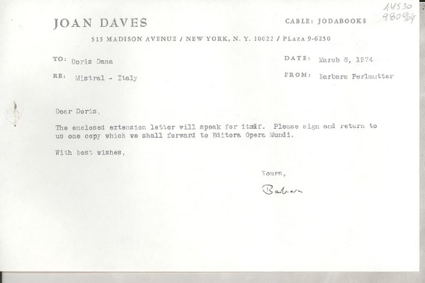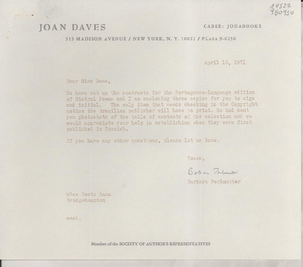 [Carta] 1971 Apr. 13, 515 Madison Avenue, New York, N. Y. 10022, Plaza 9-6250, [EE.UU.] [a] Miss Doris Dana, Bridgehampton, [EE.UU.] [manuscrito] Barbara Perlmutter.