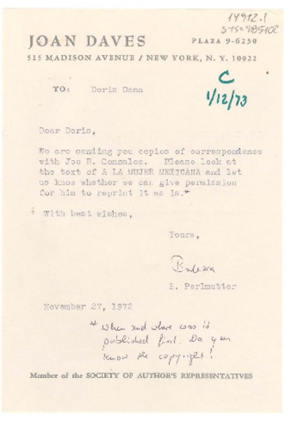 [Carta] 1972 nov. 27, [New York, Estados Unidos] [a] Doris Dana, [Estados Unidos] [manuscrito] Barbara [Perlmutter].
