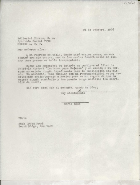 [Carta] 1966 feb. 21, Hack Green Road, Pound Ridge, New York, [EE.UU.] [a la] Editorial Porrúa, S.A., Apartado Postal 7990, México 1, D. F., México [manuscrito] Doris Dana.