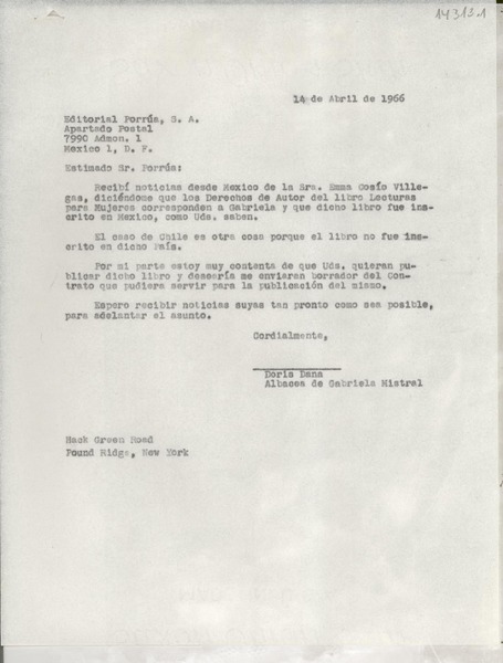 [Carta] 1966 abr. 14, Hack Green Road, Pound Ridge, New York, [EE.UU.] [a la] Editorial Porrúa, S.A., Apartado Postal 7990 Admon. 1, México 1, D. F., México [manuscrito] Doris Dana.