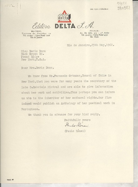 [Carta] 1962 May 25, Río de Janeiro, [Brasil] [a] Miss Doris Dana, Hack Green Rd., Pound Ridge, New York, U. S. A. [manuscrito] Paulo Rónai.