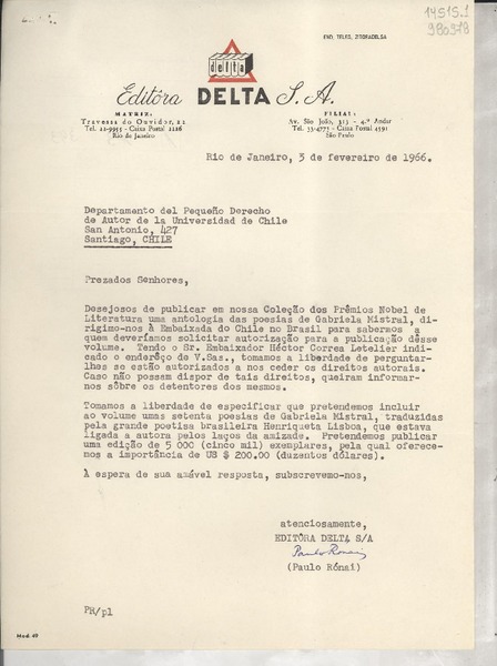 [Carta] 1966 fev. 3, Río de Janeiro, [Brasil] [a] Departamento del pequeño derecho de autor de la Universidad de Chile, San Antonio 427, Santiago, Chile [manuscrito] Paulo Rónai.