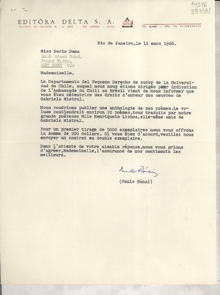 [Carta] 1966 mar. 11, Río de Janeiro, [Brasil] [a] Miss Doris Dana, Hack Green Road, Pound Ridge, New York, U. S. A. [manuscrito] Paulo Rónai.