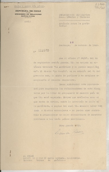 [Memorandum] N° 012370, 1948 oct. 28, Santiago, [Chile] [al] Señor Cónsul de Chile en Santa Bárbara, California, Estados Unidos de América [manuscrito] Germán Riesco.