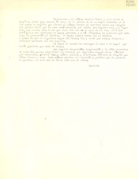 [Carta] [a] Gabriel Tomic [manuscrito] Gabriela Mistral.