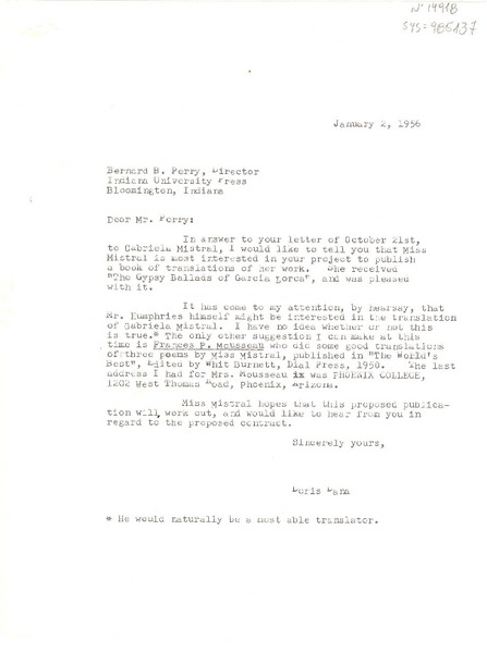 [Carta] 1956 jan. 2, [Estados Unidos] [a] Bernard B. Perry, Bloomington, Indiana, [Estados Unidos] [manuscrito] Doris Dana.
