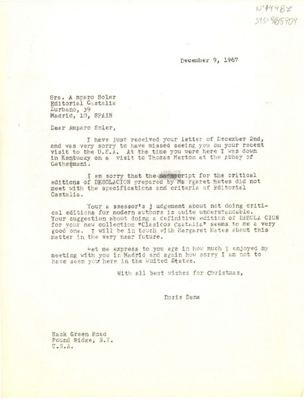 [Carta] 1967 dec. 9, Pound Ridge, U.S.A. [a] Amparo Soler, [Madrid, España] [manuscrito] Doris Dana.