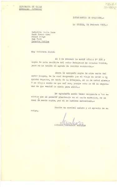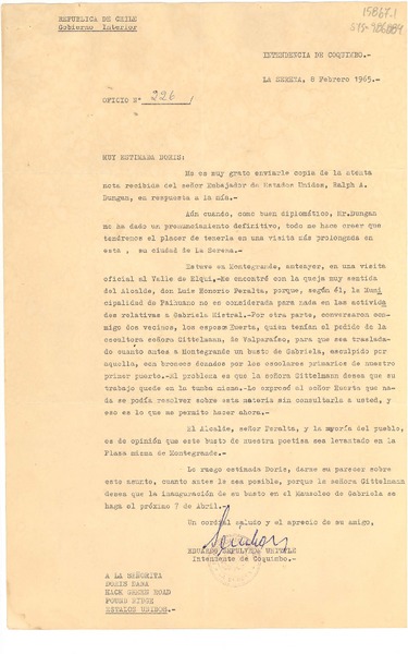 [Oficio] Nº 226, 1965 feb. 8, La Serena, Chile [a] Doris Dana, Pound Ridge, Estados Unidos [manuscrito] Eduardo Sepúlveda Whittle.