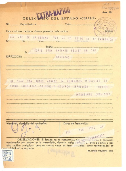 [Telegrama] [1965 dic. 20?], Coquimbo, [Chile] [a] Doris Dana, Santiago, [Chile] [manuscrito] Eduardo Sepúlveda Whittle.