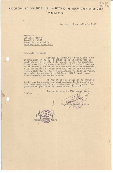 [Carta] 1948 jul. 7, Santiago, [Chile] [a la] Señorita Lucila Godoy A., Cónsul de Chile, Santa Barbara Calf., Estados Unidos de N.A. [manuscrito] Fernando Donoso Silva, Jonás Guerra Araya.