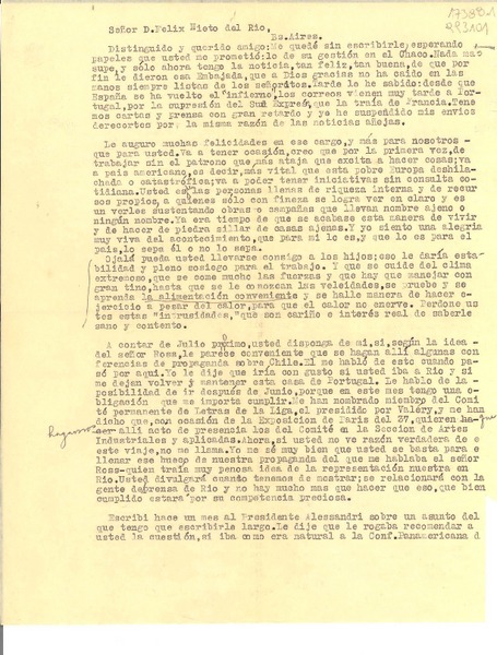 [Carta] 1936 oct. 12, [al] Señor D. Félix Nieto del Río, Bs. Aires, [Argentina] [manuscrito] [Gabriela Mistral].