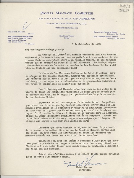 [Carta] 1948 sept. 9, Washington D. C., [Estados Unidos] [a] Muy distinguida colega y amiga [manuscrito] Mabel Vernon.