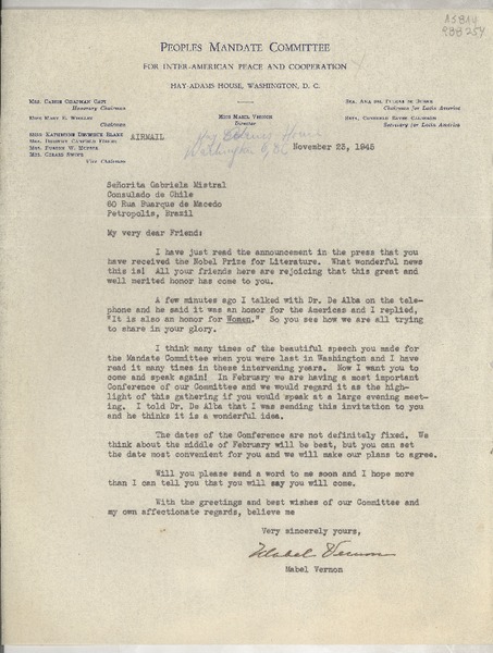 [Carta] 1945 Nov. 23, Hay-Adams House, Washington, D. C., [EE.UU.] [a la] Señorita Gabriela Mistral, Consulado de Chile, 60 Rua Buarque de Macedo, Petrópolis, Brazil [manuscrito] Mabel Vernon.