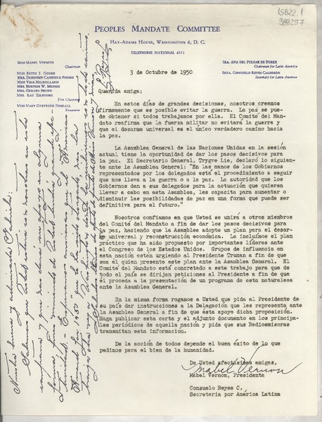 [Carta] 1950 oct. 3, Washington D. C., [Estados Unidos] [a] Querida amiga [manuscrito] Mabel Vernon.
