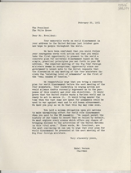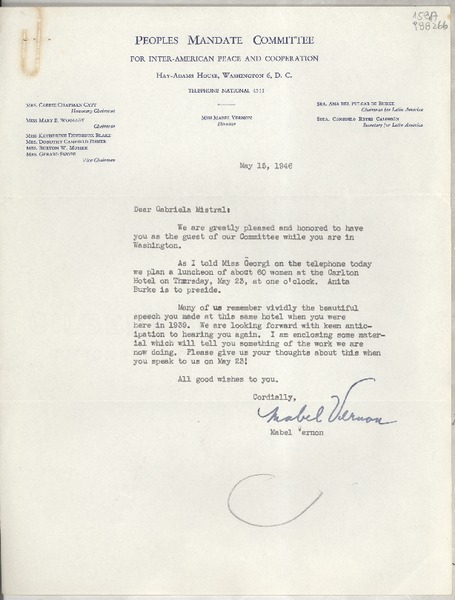 [Carta] 1946 May 15, Hay-Adams House, Washington 6, D. C., [EE.UU.] [a la] Dear Gabriela Mistral [manuscrito] Mabel Vernon.