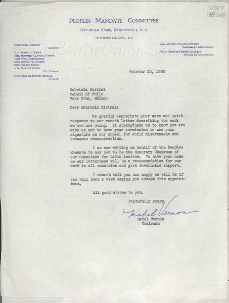 [Carta] 1950 Oct. 23, Washington D. C., [Estados Unidos] [a] Gabriela Mistral, Consul of Chile, Veracruz, México [manuscrito] Mabel Vernon.