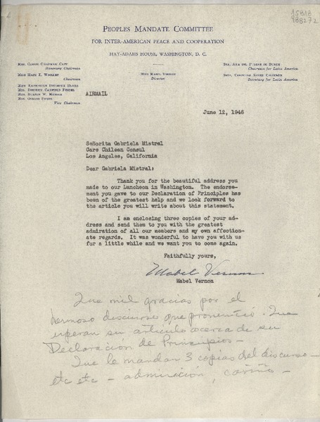 [Carta] 1946 June 12, Hay-Adams House, Washington 6, D. C., [EE.UU.] [a la] Señorita Gabriela Mistral, Care Chilean Consul, Los Angeles, California, [EE.UU.] [manuscrito] Mabel Vernon.