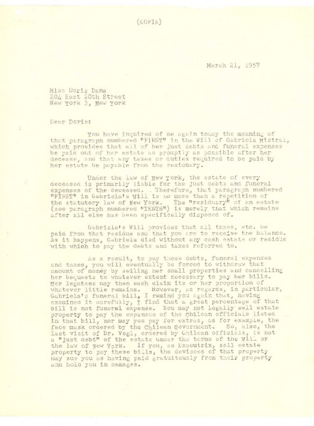 [Carta] 1957. mar. 21, New York [a] Doris Dana, New York [manuscrito] Madeleine S. Redditt.