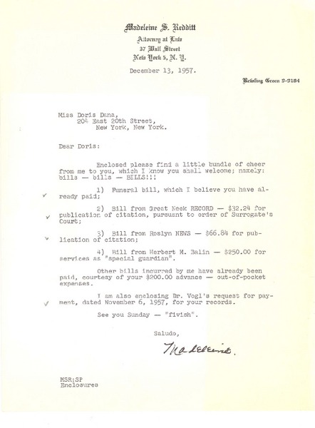 [Carta] 1957 dic. 13, [New York] [a] Doris Dana, New York [manuscrito] Madeleine S. Redditt.