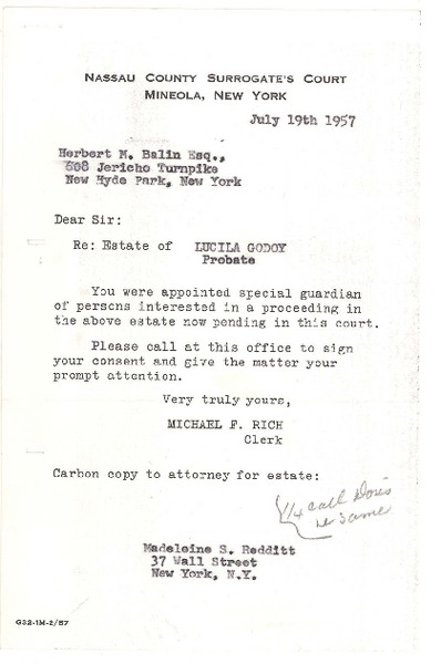 [Carta] 1957 jul. 19, New York [a] Herbert M. Balin Esq., New York [manuscrito] Michael F. Rich.