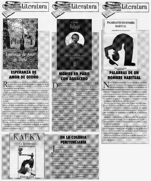 Kafka, Franz - Manzano Isla, Raúl - Vallejo, César - Autores peruanos - Esperanza de amor de otoño - Autores austríacos - Yanez Salcedo, Alejandro - Autores chilenos - Moriré en París con aguacero - Palabras de un hombre habitual - En la colonia penitenciaria