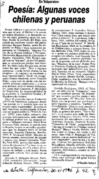 Poesía: Algunas voces chilenas y peruanas [artículo] Claudio Solar.