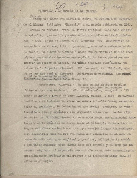 Ranquil: novela de la tierra por Reinaldo Lomboy [manuscrito] Fernando Santiván.